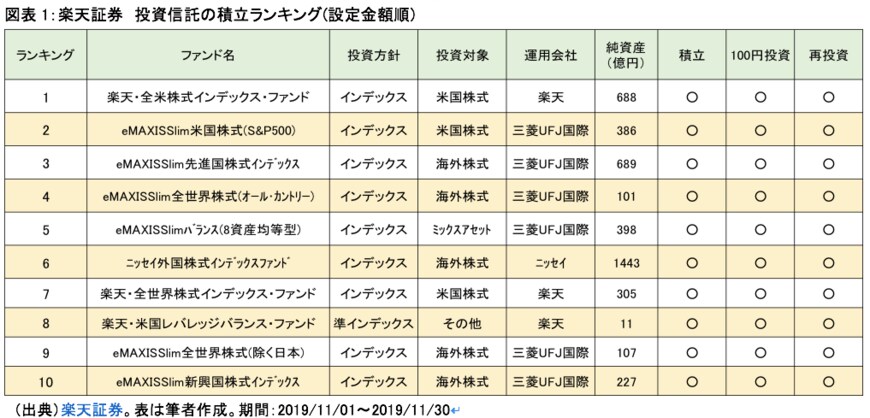 これらの投資信託はオンライン証券の楽天証券で販売している投資信託のうち、積立投資で購入されている投資信託の販売額ランキングです。