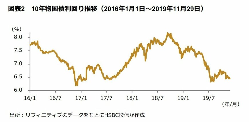 また、景気が鈍化しているにもかかわらず、中央銀行は投資家の期待を裏切った。12月5日の金融政策委員会(MPC)で、中央銀行は、総合インフレ率が目標中央値を上回ったことを指摘して、政策金利を据え置き、市場が期待していた6会合連続となる利下げを見送った。ただし、同委員会は、2019年度(2019年4月-2020年3月)の実質経済成長率見通しを6.1%から5.0%へ下方修正するとともに、景気回復に必要とされる限り金融緩和策を維持することを明らかにした。