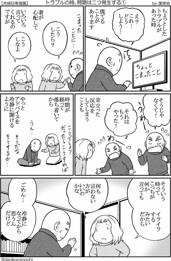 夫婦のエピソードを通してマイナスの感情や行動を見直していく漫画を、Twitterでたくさん発表している漫画家がいます。漢弾地(かんだんち)さん(@dankoromochi)です。かわいらしい絵柄の漫画で困ったことの対処法を語ります。