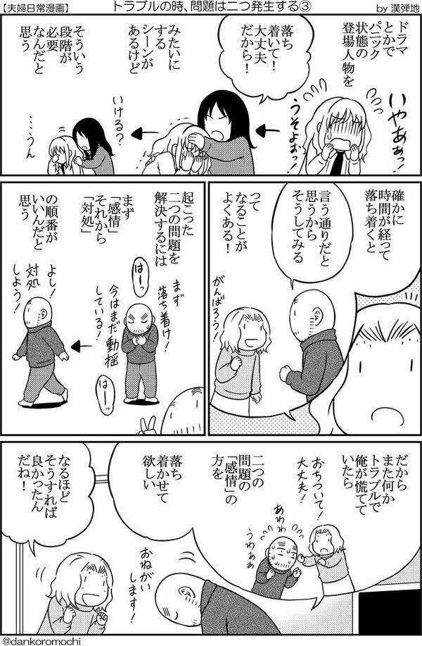 トラブル発生で慌てているときというのは、トラブルにどう対処するかということだけでなく、実は同時に、混乱して感情が乱れているのだということを、漢弾地さんは発見しました。それではどうすればいいのかということを、冷静なときに奥さんと一緒に考えて結論を出しています。