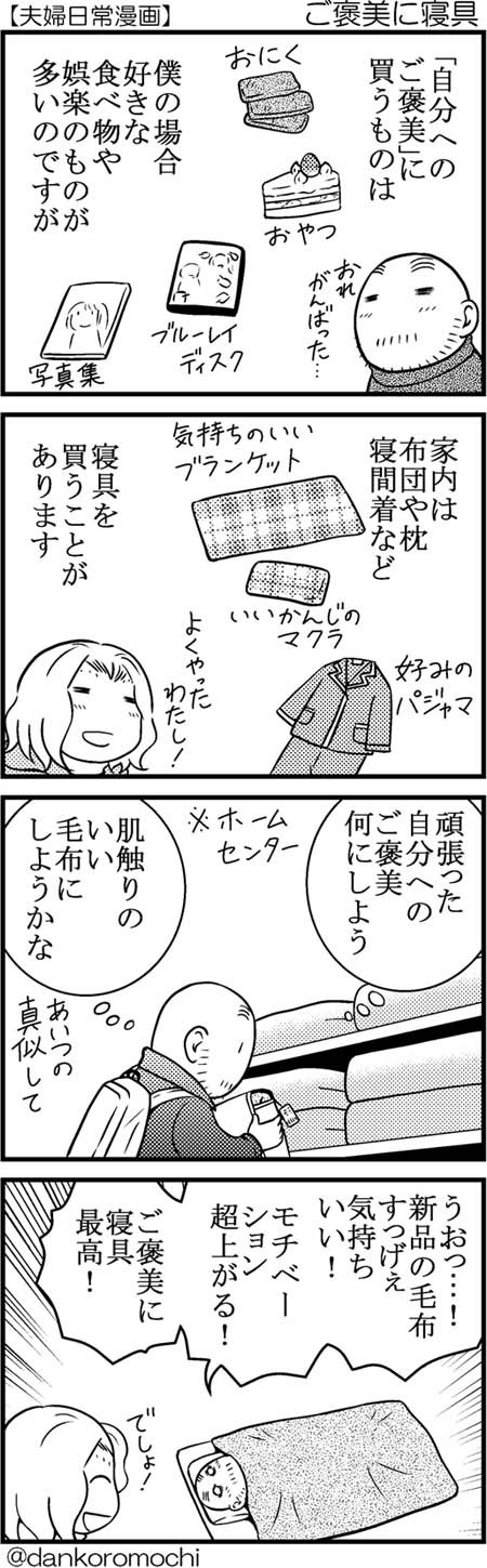 自分へのご褒美にはいつも食べものや写真集などの娯楽を用意していた漢弾地さんは、あるとき奥さんがいつもしている「寝具を買う」ということをしてみて「ご褒美として寝具は最高!」ということに気づくことができました。それは奥さんにとってもうれしいことだったでしょう。