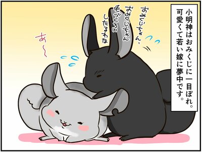 お嫁さんとしてやってきたおみくじちゃんに、ベタ惚れの小明神さん。とにかくおみくじちゃんに喜んでもらおうと、かいがいしく世話を焼く小明神さんですが、その愛は重すぎて…⁈