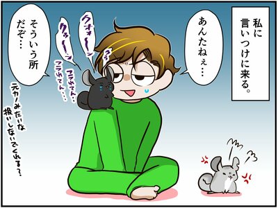 漫画家の祭さんは、小明神さん(4歳半)とおみくじちゃん(1歳)という、チンチラの夫婦と一緒に生活しています。人間でいえば、40歳手前の小明神さんと17歳ぐらいのおみくじちゃんは、おっさんとギャルの組み合わせといってもいいくらいの年の差夫婦。しかも、小明神さんはおみくじちゃんに一目ぼれとあって、若くて可愛い妻に、毎日毎日かいがいしく尽くしまくり。