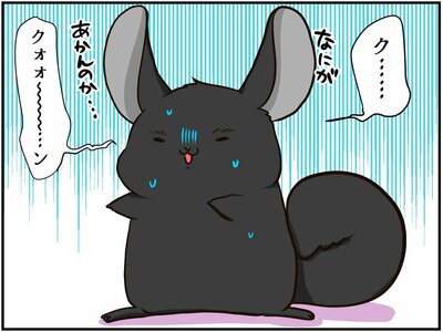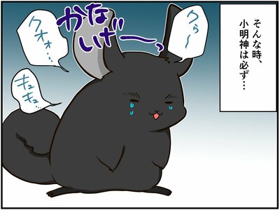 せっせせっせと毛づくろいを続ける小明神さん。しかし、しつこいからか、あまり気持ちがよくないのか、おみくじちゃんは顔をしかめはじめます。しかし、夢中になっている小明神さんは、おみくじちゃんの変化に気が付いていない様子。これでもかといわんばかりに、先ほどと同じ調子で、ぐいぐいと毛づくろいをし続けます。ついにたまりかねたおみくじちゃん。「ギャッ」と怒りの声を上げて、小明神さんを威嚇したかと思うと、ぷんぷんと怒りながら、離れていってしまいました。