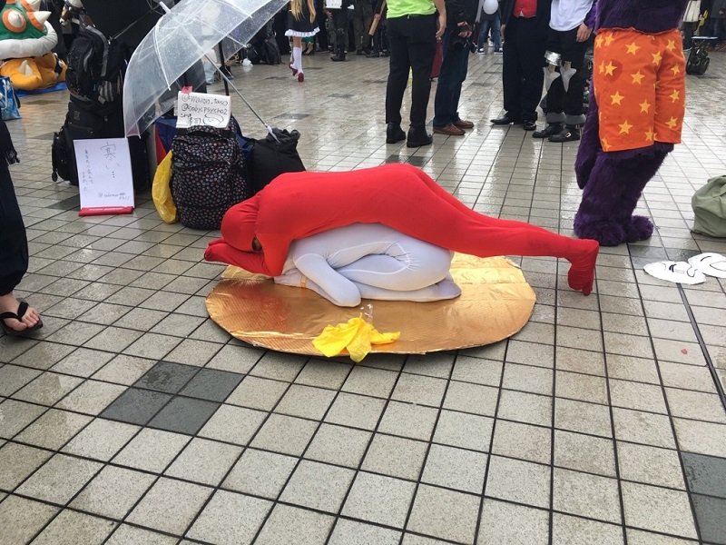 白い全身タイツの人がうずくまり、赤い全身タイツの人がその上に腹這いになることで握り寿司を表現。誰でも思いつきそうでなかなか思いつかない工夫により生まれる美食コスプレに人々は目を奪われ、足を止めます。