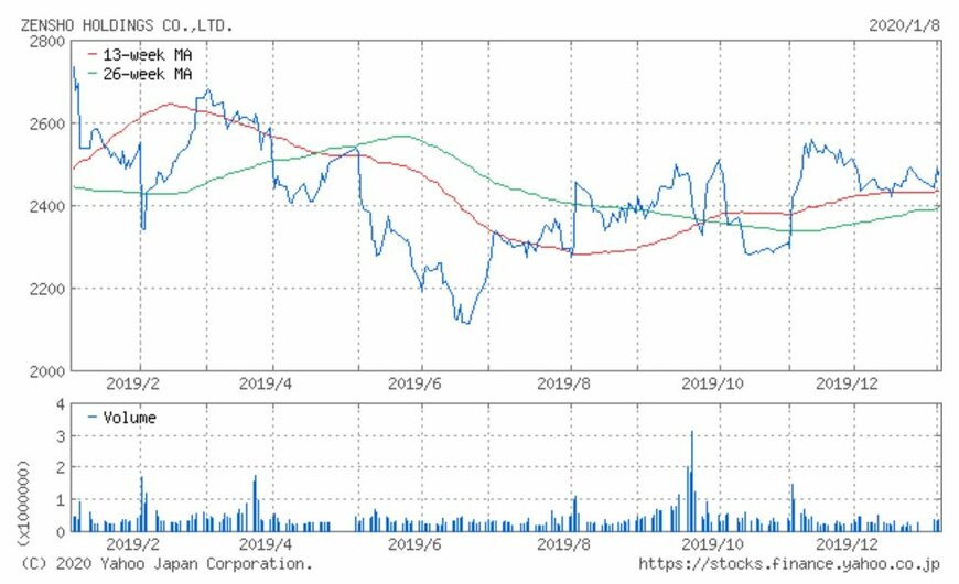 同社の2019年以降の株価は、2,500円台で値動きが停滞する傾向にあります。11月に2,300円台から2,500円台までの上昇を果たしましたが、11月15日の2,584円をピークに下落し、その後は2,400-2,500円内での取引が続いています。