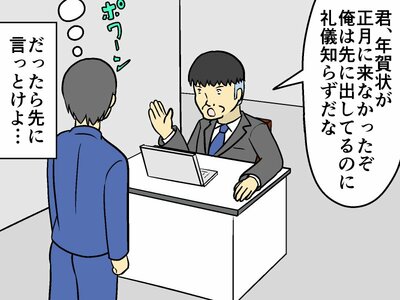 自宅に送られてきた上司からの年賀状。しまった!自分は出していない…。遅ればせながら返事は出したものの、年明けの出勤にて、上司に元旦に年賀状が来ていなかったことを指摘されてしまい…⁈