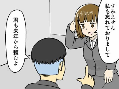 「実は、それが私からの年賀状です。係長が郵便局で年賀状を買う前に、ちょっと仕込ませていただきました。」とにっこり笑う主人公。「そうか!ちゃんと先にもらっていたんだな!」と納得する係長…。