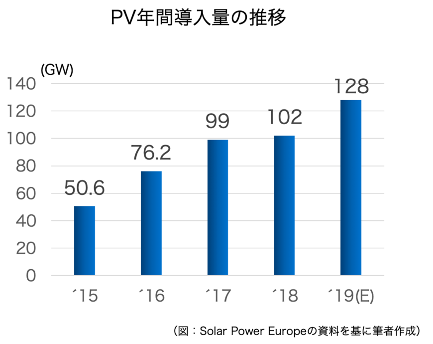 18年はPVの年間導入量が100GW(IEAは99.9GW、SolarPower Europeは102.4GWと算出)の大台に達したが、19年はさらにこれを上回る導入が実現しそうだ。