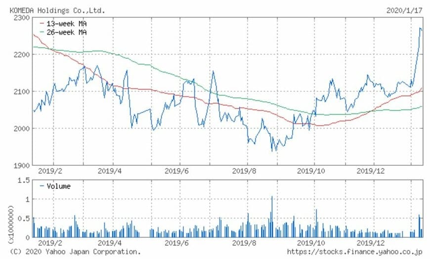 同社の株価は、2018年10月に高値2,400円を付けた後に反落。2019年はおおむね1,950円~2,150円間のレンジ相場が続きました。2020年に入り株価はレンジ上限の2,150円を巡る攻防が続いていましたが、1月14日には2,200円台に乗り、2,300円台をうかがう状態です。