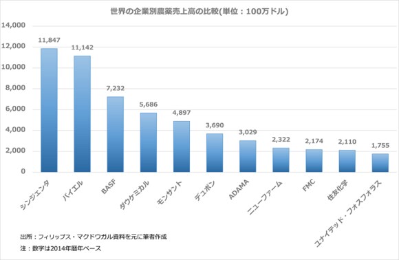種子大手のモンサントと、バイエルの農薬事業であるバイエルクロップサイエンスの統合が実現すると、売上高265億ドル(約2.7兆円)の農業関連売上高が実現します。これは昨年12月に合併合意されたダウケミカルとデュポンの農業関連売上高合計や、今年2月の中国化工集団による世界最大の農薬企業シンジェンタ(スイス)買収の規模をはるかに上回ります。