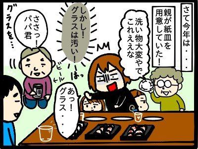 一昨年は、耐えきれずに食器の洗い直しを試みたねこねこむさん。しかし、いざ洗おうとすると、シンクに置かれていたのは年季が入ってデロデロになったスポンジ。そして、食器を拭くためのふきんも、拭いた後のほうが汚いのでは?と思うような代物…。実家のものは基本的に汚れていると悟った彼女は、昨年はついに使い捨ての紙皿とふきん類を持参するという荒業を繰り出しました。(「これが義実家だったらとてもできない。実家で良かった(?)」と心の中で思いつつ…)
