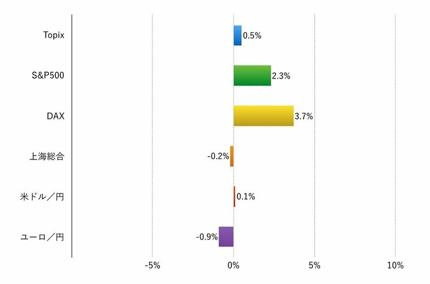 このため、ユーロ安を受けて欧州株が高く、また、前週に続き世界的にテクノロジー株が上昇しています。さらに、ベトナム・ブラジル株を除けば新興市場の株式がおおむね堅調だったことも大切なポイントです。