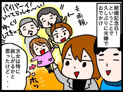 結婚記念日に夫の実家に子どもたちを預け、夫婦だけでおでかけをすることにしたねこねこむさん。夫とその両親の心遣いに感謝しつつ、「今日は、夜までゆっくり楽しませてもらおう。」と出かけましたが…?
