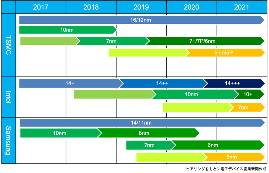 スマートフォン分野では5G商用化に伴い、プロセッサー部で微細化ニーズが拡大しているほか、サーバーやインフラ向けのHPC(High Performance Computing)分野でも先端プロセスの要求が増している。こうした流れを受けて、ロジック/ファンドリー各社は先端プロセス投資を強めている。