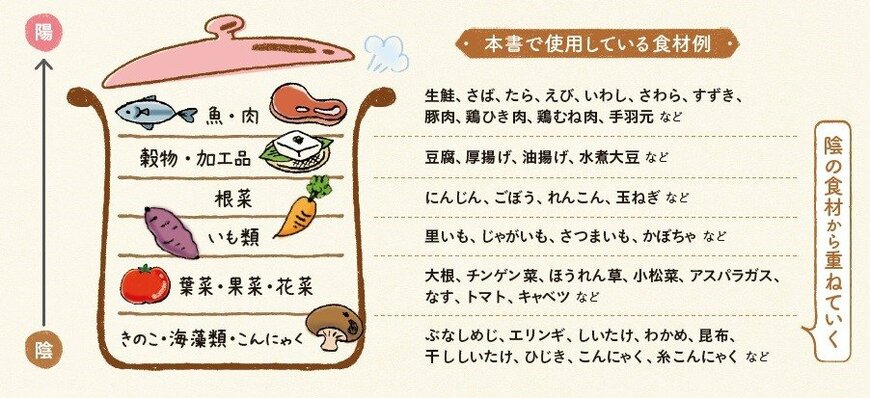 大切なのは、食材を重ねる順番を守ること。⾷材を陰性→陽性の順に下から重ねることによって、からだが本来持っている免疫⼒を⾼めることができるのです。