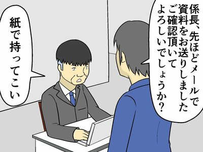 印刷の手間を省くため、上司へのメールに資料を送付したところ、「紙で確認したい。印刷したものを持ってこい。」との指示。「添付ファイルを開けば、簡単に見ることができるのに…。」と思いつつ、結局資料を印刷することに…。