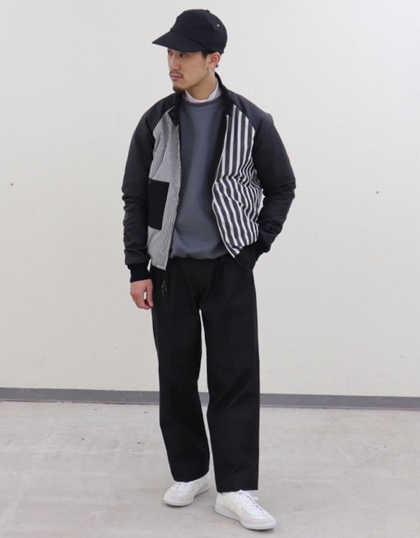 提案してくれたエディフィス京都店のスタッフさんの実際の着用画像がこちら。ブラック基調でまとめたコーディネートがクールですね。足元にはホワイトのジャーマントレーナーをチョイスしているのも技ありです。