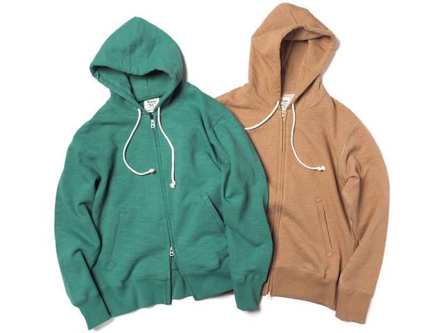 この頃気になるジップパーカー。ここ2、3年ほどプルオーバーが主流だった中、そろそろジップタイプにも光が当たりそう…。〈ジャックマン〉は福井県発祥のファクトリーブランド。ヴィンテージミシンによって生み出される美しい縫製は他では味わえません。中にプリントモノのTシャツあたりを挟んで、ジップは開けて着ちゃいましょう。