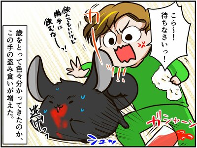 漫画家の祭さんは、小明神さんとおみくじちゃんというチンチラの夫婦と一緒に生活しています。チンチラはとても繊細な動物。いざ飼うとなると、飼育環境はもちろん、「歯が伸びすぎないように毎日牧草を与える」「水分の多いものは避ける」「与えすぎに注意」等々…、食べ物にはとても気をつかう必要があります(12話、20話参照)。