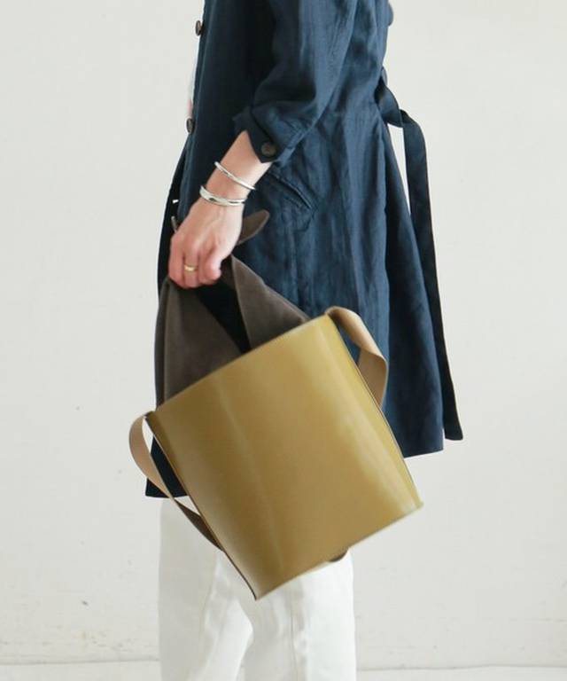 ツヤのあるレザーに、カジュアルなテープのショルダーを組み合わせたバケツ型トートバッグ。内側には中が見えないようベロアの被せが付いていて、ゆるく結べばハンドバッグとしても使えます。