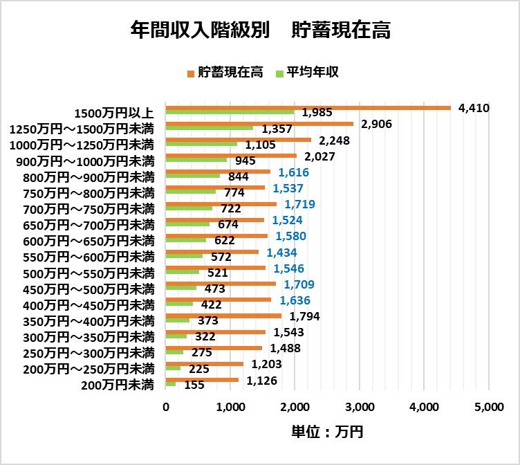 年収350~400万円に達するまで、および年収が900万円を超えると、貯蓄現在高は一律に増加していくことがわかります。ところが、年収400~900万円未満の部分だけに注目すると、「年収が高いほど世帯の貯蓄現在高が増える」とはいえない状況です。
