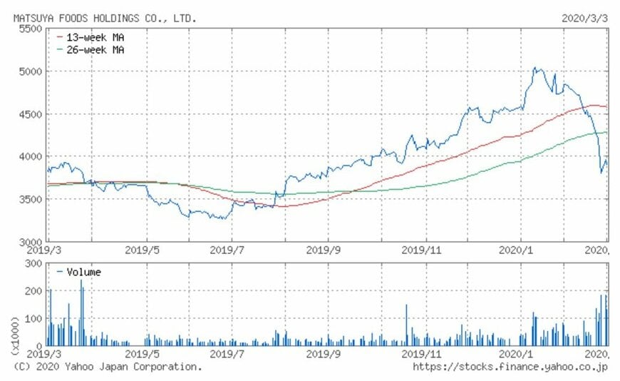 同社の株価は2019年7月から上昇が続き、2020年1月には5,130円の高値に到達しました。しかしその後は反落。2月後半の世界的な株価下落を背景に、2月28日には4,000円を割れました。