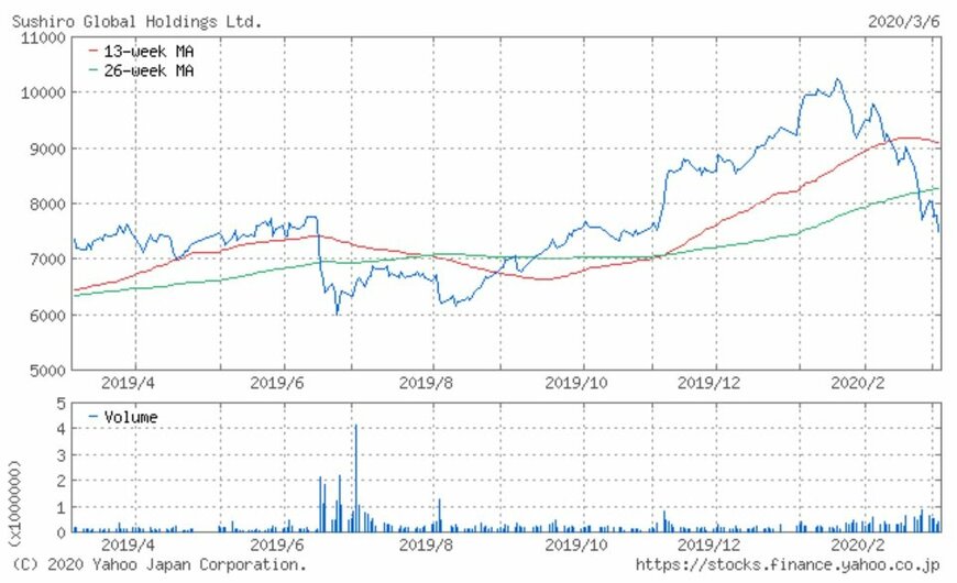 同社の株価は2019年6月の5,990円を底に上昇し、2020年1月には10,000円に到達しました。ただし10,000円の維持はできずに反落し、2月後半の株式市場全体の下落により3月6日に終値で7,500円を割りました。