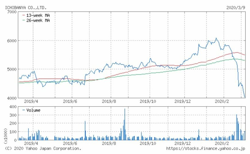 同社の株価は2018年12月の3,815円を安値に上昇しており、2020年1月には6,130円の高値に到達しました。その後反落する中で2月の株式市場全体の下落も重なり、3月9日には終値で4,000円近くまで下げました。