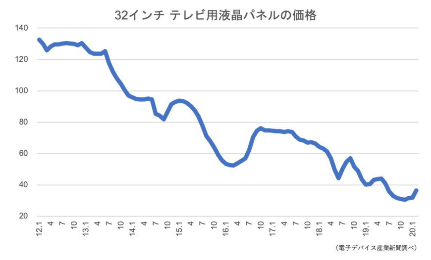 価格反転に最も大きく寄与しているのが、韓国の液晶パネルメーカーがテレビ用液晶パネルの生産能力を削減していることだ。中国の液晶パネルメーカーが生産能力を積極的に拡大し続け、これに伴って19年に価格が暴落したことで、韓国メーカーは液晶から有機ELへ事業の中心をシフトしつつあることが背景にある。