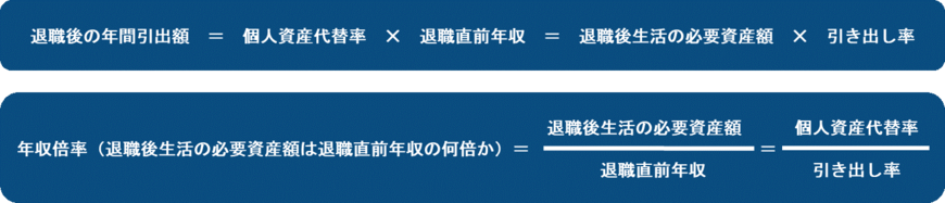 たとえば、引き出し額は、引き出し率と必要資産額を使っても、また「個人資産代替率」と退職直前年収を使っても計算できます。そこから必要資産額を退職直前年収で割った「年収倍率」は、データから推計できる「個人資産代替率」を引き出し率で割って算出できるというわけです。