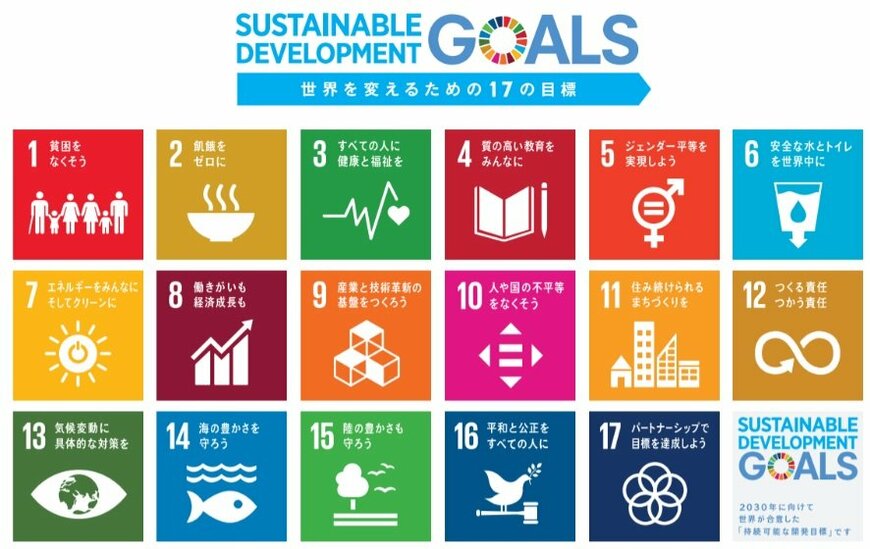 上図にあるように、17のゴールとは、貧困と飢餓を地球上からなくすこと、最貧困の人々の健康状態を改善すること、すべての人に質の高い教育を確保すること、ジェンダー平等を実現すること、気候変動への取り組みを進めて環境を守ること等々といったものになります。