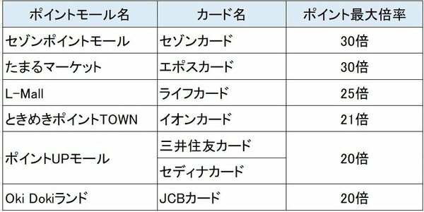 代表的なポイントモールと運営しているカード発行会社、そしてポイント最大倍率は下記のとおりです。