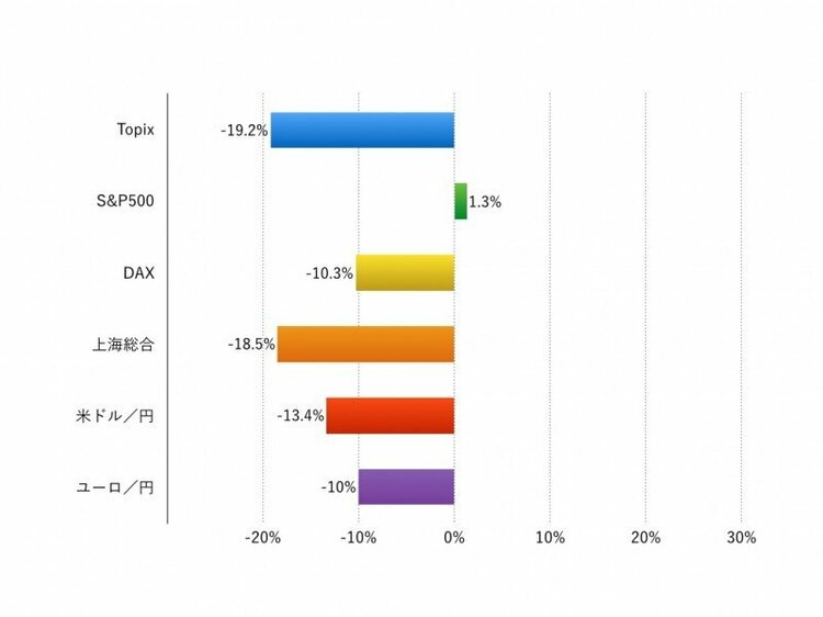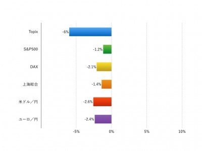この結果、円は独歩高の展開になり、TOPIXを前週末比▲6%下落させました。年初来の現地通貨ベースのパフォーマンスにおいて、TOPIXが上海総合指数を抜いて主要国でワーストになりました(▲19%)。このほか、先週は香港、韓国、豪州株の下げが目立ちました。英独仏の各国株式市場も下げています。