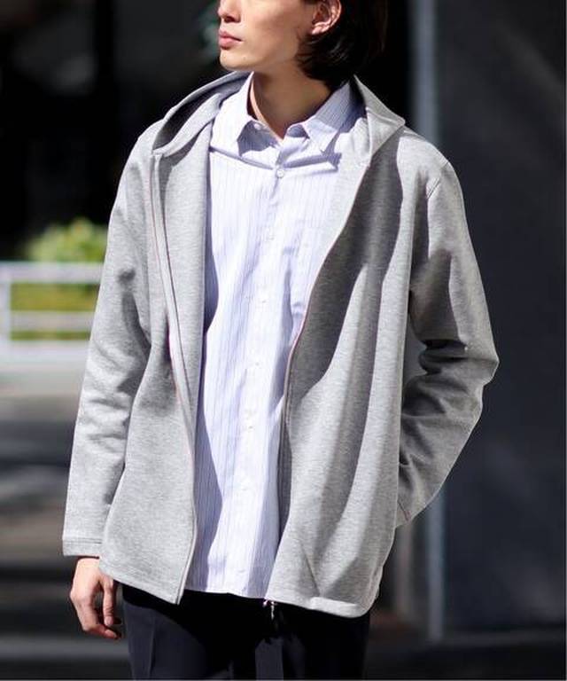 キレイめなパーカーが欲しいなら、ダンボールニットで探してみるのがオススメ。光沢感&ハリがあり、パーカーといえどカジュアルにはなりすぎません。