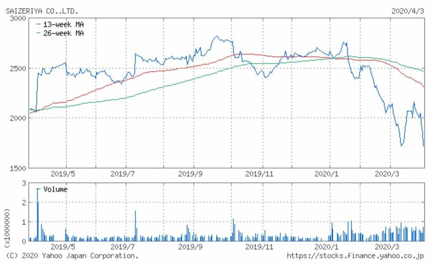 同社の2019年の株価は、2,800円台を天井とする値動きが続きました。2020年1月も2,811円到達後に反落しています。そして2月の株式市場全体の急落を受け、3月13日には1,649円まで下落しました。その後いったん2,100円台を回復したものの再び下落し、2,000円割れの水準で取引されています。