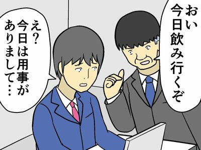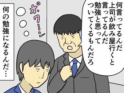 仕事が終わり、さあ帰ろうと思ったところに「飲みに行くぞ」という上司からのお誘い。断ろうとするも「上司が行くと言ったら勉強と思ってついてくるもんだ。」と主張され、仕方なく付き合う羽目になる部下…。