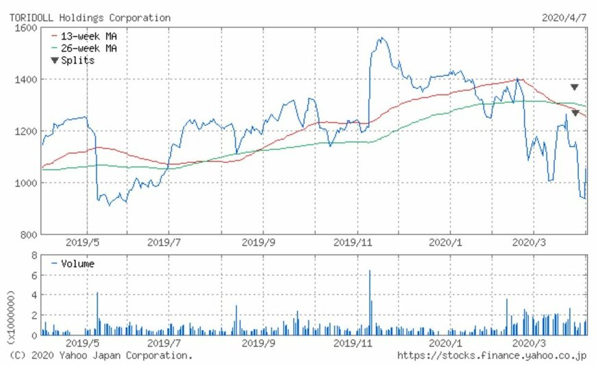 同社株価は昨年11月に1,585円の高値を付けた後に反落。2020年に入っても下落は止まらず、2月後半からの株式市場全体の下落もあり、3月には一時1,000円を割れました。