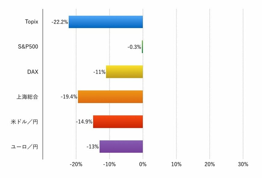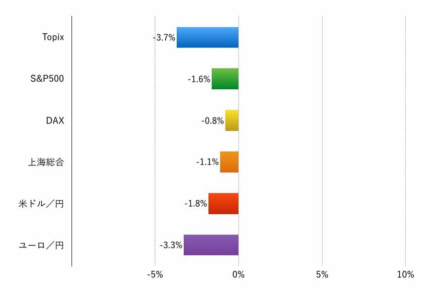 一方、下げが厳しかったのは円高が直撃した日本株(TOPIX)やイタリア(FTSE MIB)などで同▲4%、▲7%となりました。日本株は着々と年初来のワーストパフォーマーのポジションを固めつつあります。