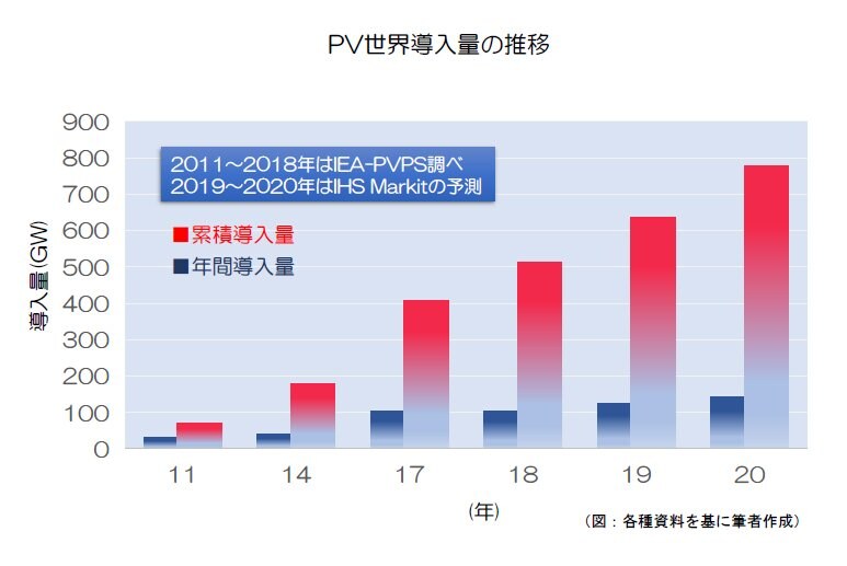 2019年もPV市場は大きな成長を遂げた。19年のPV導入量については、台湾EnergyTrendが123GW、英IHS Markitが124GWという数値を発表している。いずれにしろ、前年比2割増と大幅に伸びたようだ。最大市場である中国の成長が鈍化したが、発電コストの低下などを背景に世界市場で導入が加速している。