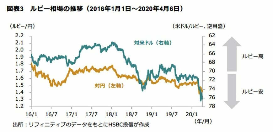 インドルピーは対米ドル、対円ともに本年2月下旬以降は新型コロナウイルスの感染者の世界的な広がりを受けた投資家のリスク回避志向の高まりを受けて、他の新興国通貨とともに急落している。