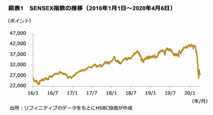 インド株式市場は、2020年1月下旬以降、新型コロナウイルスの感染拡大を背景とした世界的な株安を受けて大幅に下落している(4月6日現在)。