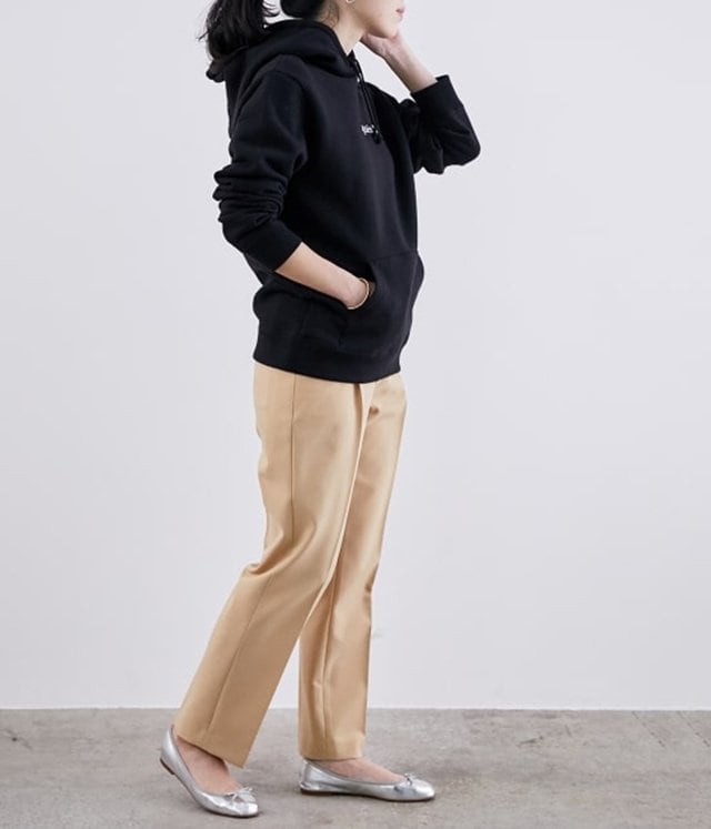 黒パーカーとベージュパンツも相性バツグンな組み合わせ。メタリックパンプスなどポイントになるシューズを合わせる事で、トレンド感を演出できます。