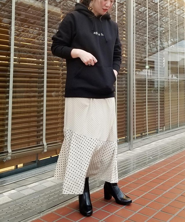 春らしいドット柄スカートも、黒パーカーと合わせる事で甘過ぎず大人な雰囲気に。足元はレザーブーツで辛口に合わせるのが気分!