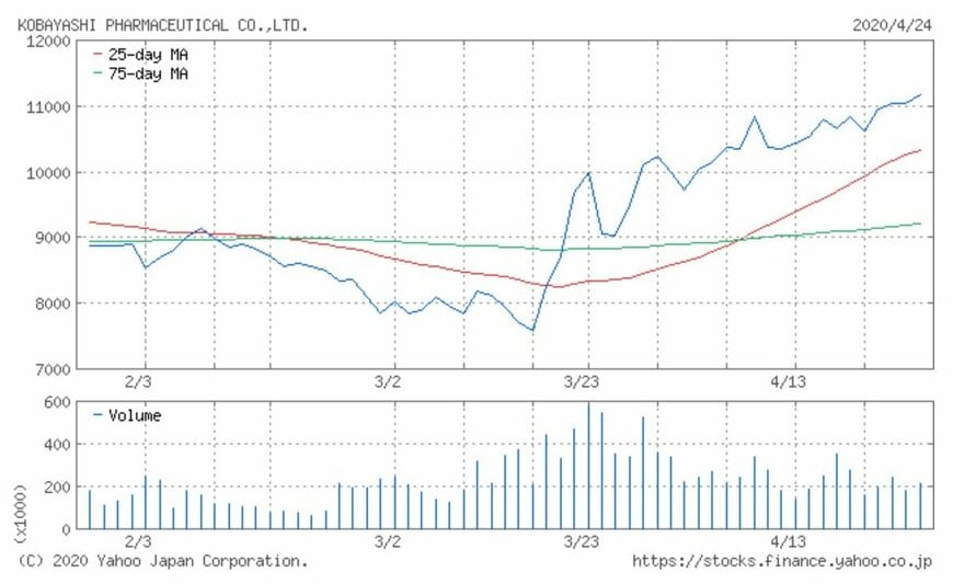 また、医薬品株も総じて堅調に推移し、中外製薬(4519)が大きく値を上げ、除菌関連商品の特需を背景に株価上昇が続く小林製薬(4967)は上場来高値を更新しています。