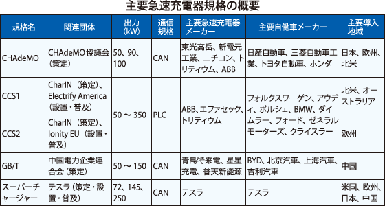 次にCHAdeMO以外の急速充電器の規格について説明する。世界的には「Combined Charging System(CCS1)」、CCS2、「GB/T」、「スーパーチャージャー」などがあり、CHAdeMOを含め、これら5つが代表的だ。それぞれの出力を見てみると、CHAdeMOは50kWが中心で、より高出力の90kW、100kWも製品化されている。一方、CCS1/CCS2が50~350kW、GB/Tが50~150kW、スーパーチャージャーが72kW(Supercharger V1)、145kW(同V2)、250kW(同V3)となっている。現状、CHAdeMOが最も低く、CCS1/CCS2が最も高い。
