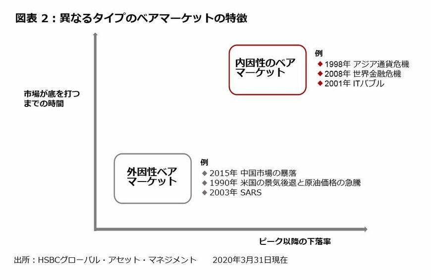 この理論は、外因性の衝撃から生じるベアマーケットの方が内因性のものより下落率が小さく、早い回復が期待できることを示唆している(図表2参照)。