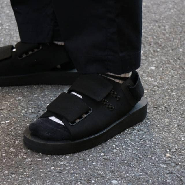 秋〜春までのご近所履きではソックス×サンダルもポピュラー。ただサンダルによってはへんてこな感じにもなりかねないので、〈スイコック〉と〈デサント〉のコラボサンダルのようにソックスと相性の良い一足があると便利です。