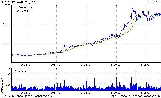 たとえば、アベノミクスが始まった時期にあたる2012年末から2016年7月1日までの同社株は約5.3倍になっています。日本の小売セクターで、これを上回るパフォーマンスを上げたのはスタートトゥデイ(3092)とセリア(2782)しかありません。同期間のTOPIXの上昇率は+46%ですので、良品計画株のパフォーマンスの高さ、市場の期待の高さを理解していただけるでしょう。