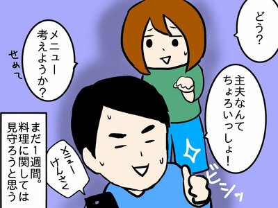 5日目にして「やはり大変なのかも」と感じたねこねこむさんは、夫に「メニュー一緒に考えようか?」と提案しますが、手元のスマホで一生懸命にメニュー検索をしながら何とか頑張ろうとしている夫の姿に、「まだ1週間だし。」と、料理に関しては見守る決意をしました。